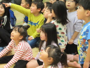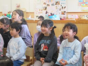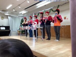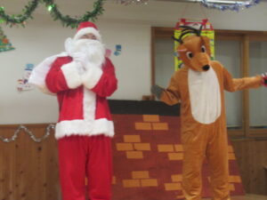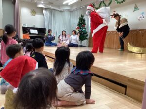 12月25日にクリスマス会を行いました。保育者の劇を見た後はサンタさんとトナカイの登場!!