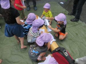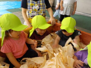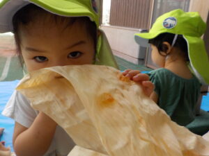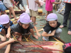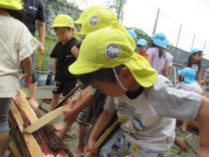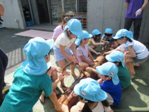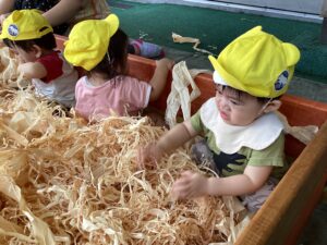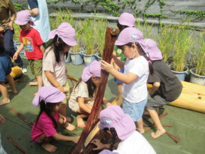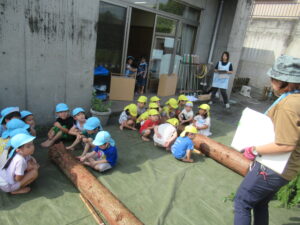 9月16日(火)に木育活動を行いました。幼児組は大きな丸太の皮むきに挑戦しました。木の皮は厚く硬かったのですが、子どもたちは一生懸命皮むきをしていました。皮むきを終えると雑巾で表面を拭き、きれいな丸太になりました。乳児組はひのきのプールを体験し、ひのきの香りや感触を楽しむことができました。