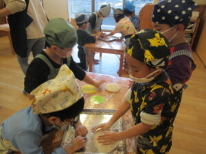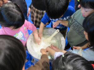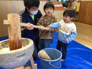 12月17日(水)に餅つきを行いました。みんなの元気いっぱいな「よいしょー!」という掛け声に合わせて、2~5歳児の子ども達が餅をつきました。ついた餅は道組の子ども達が鏡餅用に丸めてくれました。きれいに丸くなるように丁寧に形を整えてくれました。